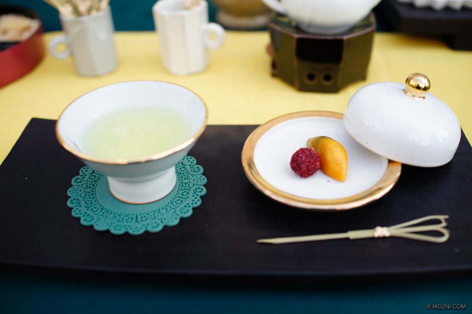 꽤나 고급스러운 찻잔과 고운 빛깔의 다과가 시선부터 사로잡더군요.