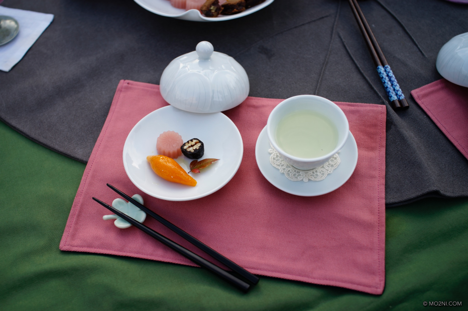 이번에는 녹차네요. 다과 중에는 귤 껍질채로 만드는 감귤정과가 일품이었습니다. 사진 상엔 주황색 다과 입니다.