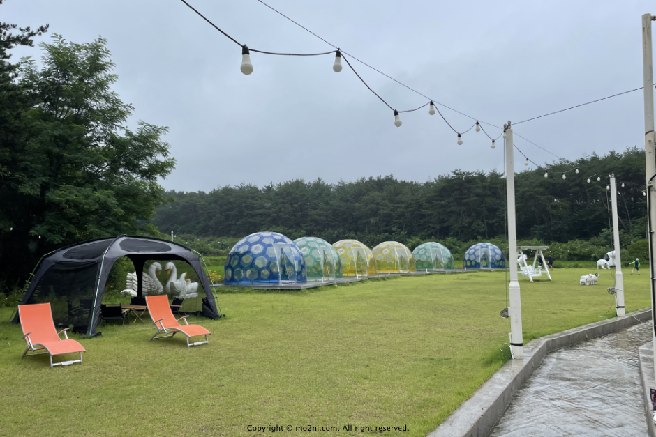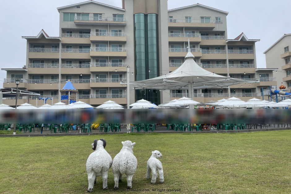 수영장 뒷편으로는 잔디밭이랑 쉴 수 있는 곳이 있어, 아이들이 마음껏 뛰어놀 수 있어 좋았습니다.